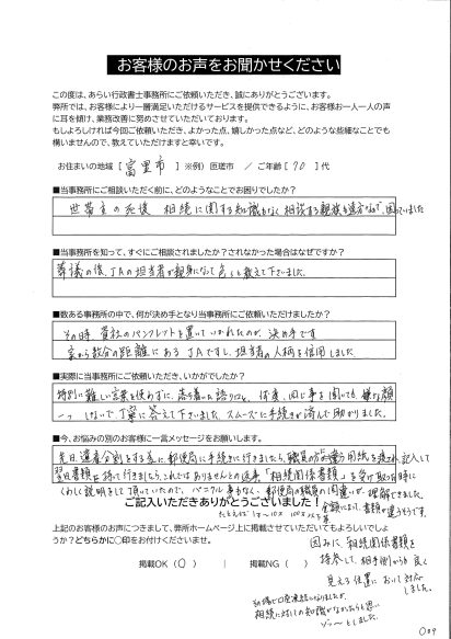 「JAの担当の方から紹介いただき、面談の場を設けていただいたのが本当にありがたかったです。最初はとても不安でしたが、特別に難しい言葉を使わずに、落ち着いた語り口で説明してくれたので、安心してお願いできました。何度同じことを聞いても嫌な顔一つせず、丁寧に答えてくださり感謝しています。スムーズに手続きが済み、本当に助かりました。」