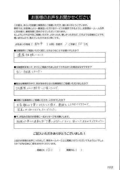 大変親切丁寧に対応していただきました。LINEで連絡ができたこともとても助かりました。写真のやり取りもスムーズで、相談に対する返事も早く、何よりも安心してお任せできたことが一番よかったです。初めての相続手続きで不安も多かったのですが、こちらにお願いして本当によかったと思っています。