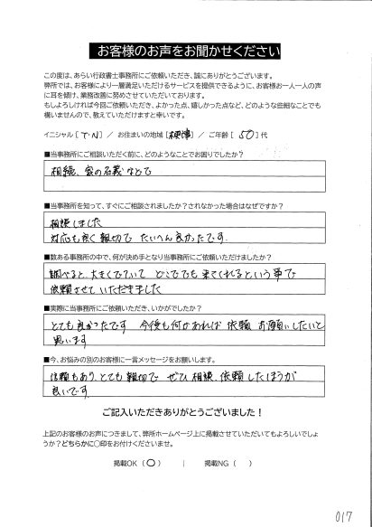 インターネットで行政書士を探していたところ、あらい行政書士事務所 のサイトをご覧になり、「千葉県内どこでも来てくれる」という点に魅力を感じていただき、ご依頼を決断されました。