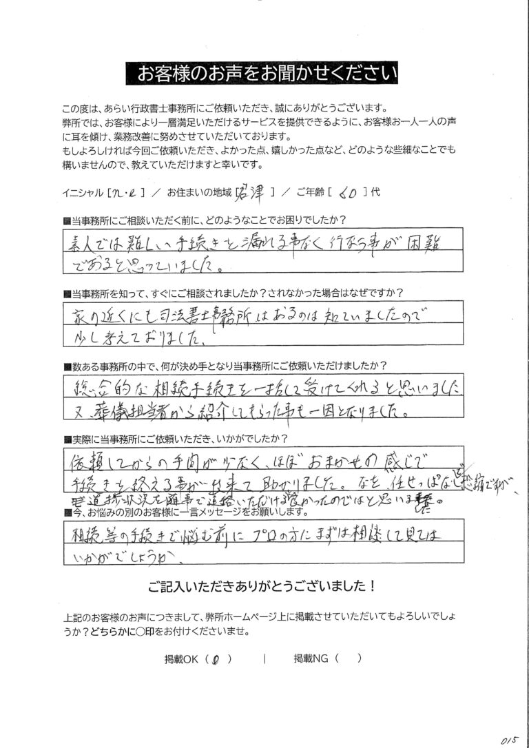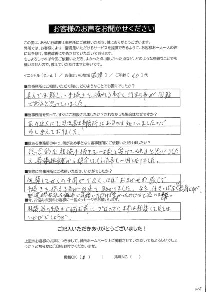 最初は不安でしたが、担当の方がしっかりサポートしてくださったおかげで、気持ちも落ち着き、無事に手続きを終えることができました。自分のように手続きに不安を感じている方には、ぜひおすすめしたい事務所です。