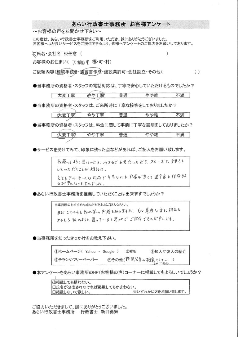 手続きもスムーズに進めていただき、本当に助かりました。身近な人に相続や遺言で悩んでいる方がいたら、「私もお願いしたけどとても良かったよ」と自信を持って紹介したいと思っています。
