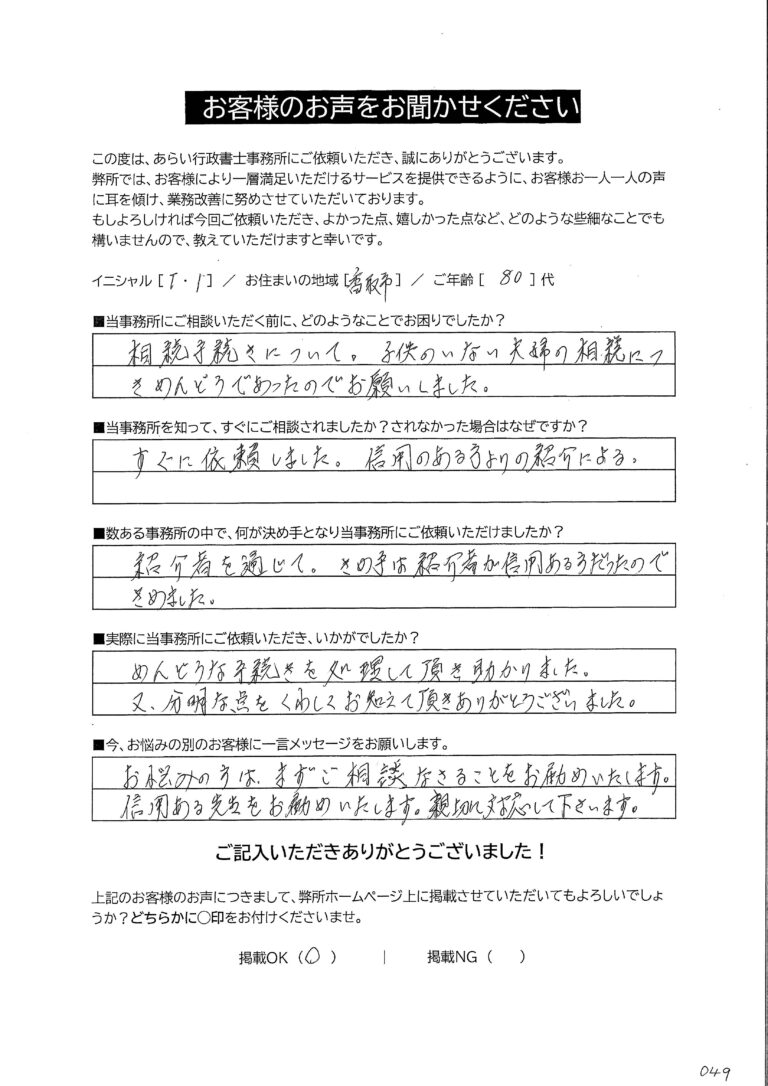 先生にお願いしてからは、面倒な手続きをすべて整理して進めてくださり、本当に助かりました。難しい言葉を使わず、ひとつひとつ丁寧に説明してくださったので、安心してお任せすることができました。