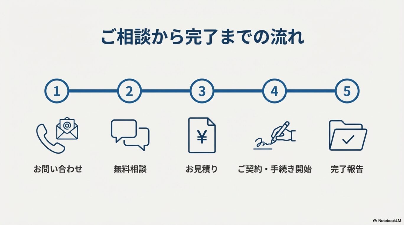 初回相談で現状を丁寧にヒアリングし、必要な手続きや今後の進め方を交通整理できれば、その後の工程は専門家が代わりに進めていきます。